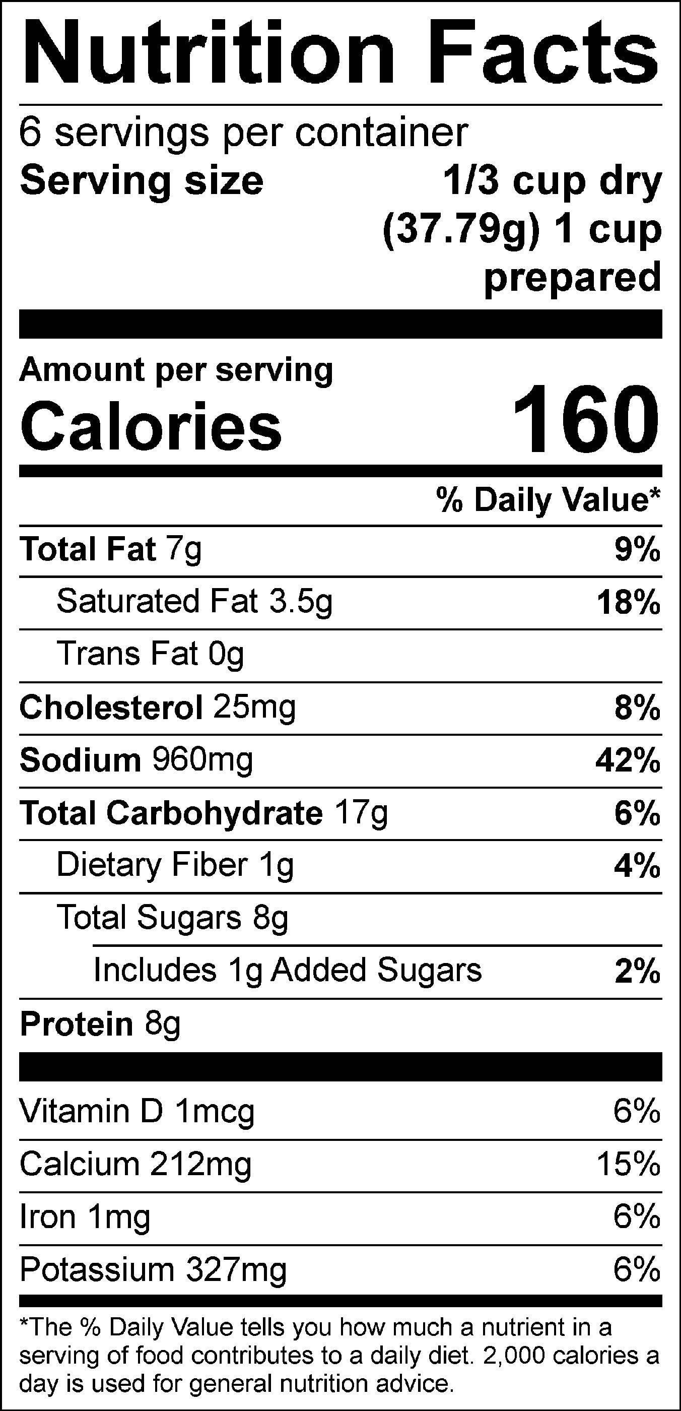 Ingredients: Country Gravy (Corn Starch, Flour (Bleached Wheat Flour, Malted Barley Flour, Niacin, Iron, Potassium Bromate, Thiamine Mononitrate , Riboflavin, Folic Acid), Whey (Sweet Whey(Milk)), Buttermilk Powder (Sweet Cream Buttermilk), Corn Syrup Solids, Whole Milk Powder (Whole Milk Solids), Nonfat Dry Milk, Salt, Canola Oil, Black Pepper), Sharpee Cheddar Cheese ( Milk, Cheese Culture, Salt, Enzymes), Whey, Buttermilk Solids, Salt, Sodium Phosphate, Lactic Acid), Cheddar Cheese ( Milk, Salt, Cultures & Enzymes), Disodium Phosphate, Annatto Color), Broccoli, Chicken Flavor (Autolyzed Yeast Extract, Maltodextrin, Natural Flavor, Canola Oil), Onions Minced, Sugar, Dipotassium Phosphate, Disodium Inosinate And Disodium Guanylate (Flavor Enhancers).
