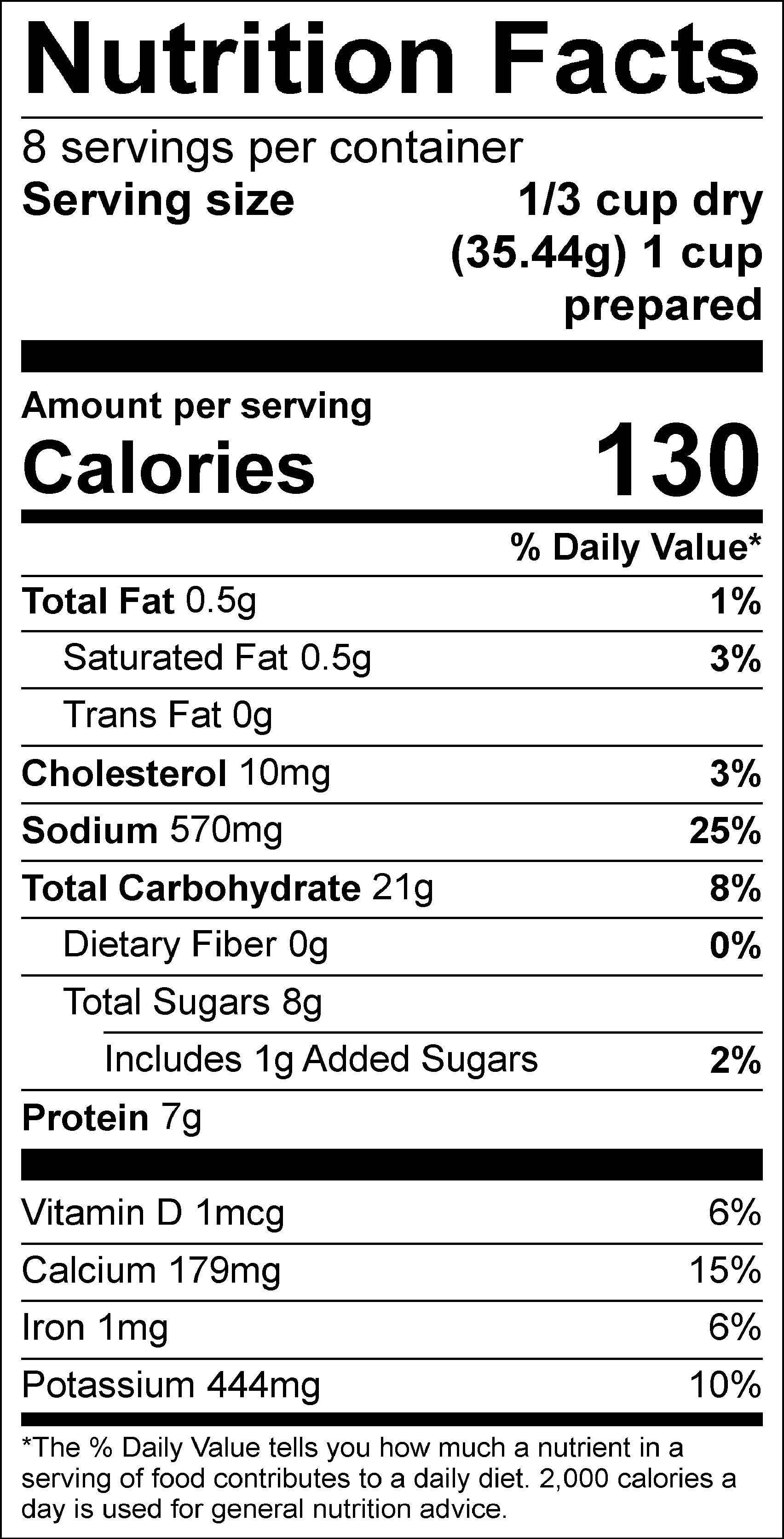 Ingredients: Sweet Cream Buttermilk, Potatoes, Country Gravy (Corn Starch, Flour (Bleached Wheat Flour, Malted Barley Flour, Niacin, Iron, Potassium Bromate, Thiamine Mononitrate, Riboflavin, Folic Acid), Whey (Sweet Whey (Milk)), Buttermilk Powder (Sweet Cream Buttermilk), Corn Syrup Solids, Whole Milkpowder (Whole Milk Solids), Nonfat Dry Milk, Salt, Canola Oil, Black Pepper),Chicken Flavor (Autolyzed Yeast Extract, Maltodextrin, Natural Flavor, Canola Oil), Onions Minced, Sugar, Flour (Bleached Wheat Flour, Malted Barley Flour, Niacin, Iron, Potassium Bromate, Thiamine Mononitrate, Riboflavin, Folic Acid), Garlicpowder, Dipotassium Phosphate, Disodium Inosinate And Disodium Guanylate(Flavor Enhancers), Spices, Ground Celery.