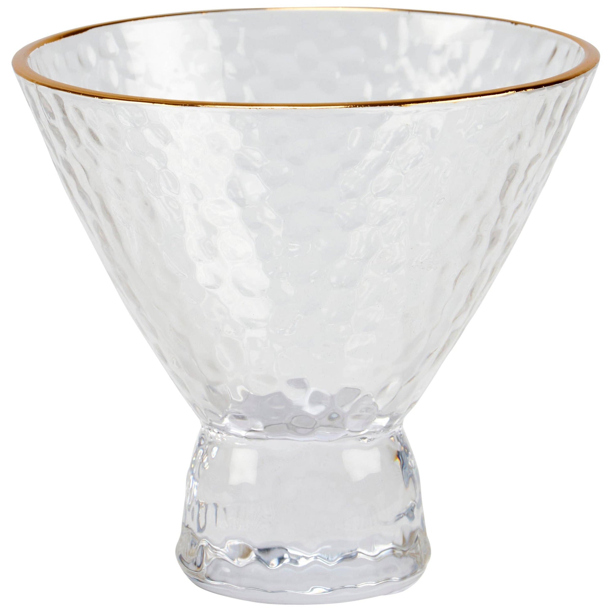 An 8 oz martini glass displaying an art deco inspired design with textured glass and metallic gold accent on the rim. Our small Gold Rim martini glass coordinates well with table décor from our Art Deco Collection. Hand wash only. A piece of vintage drinkware perfect for everyday gatherings.