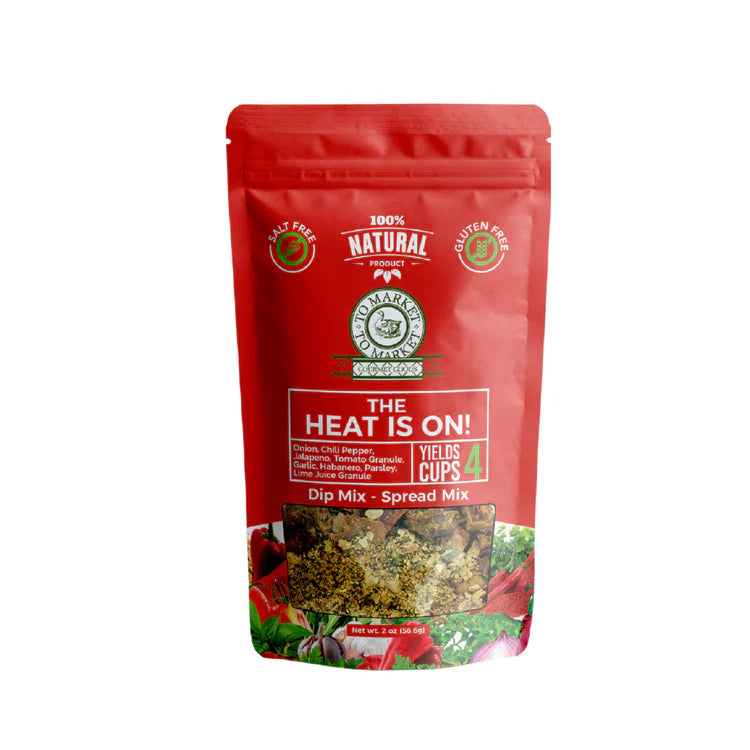 Looking for a great way to spice up your food? The Heat is On packs a punch with great heat from Habanero and Jalapeno! Perfect addition to chili or queso! No Chemicals, No Preservatives, No Salt. One packet yields 4 cups of dip.